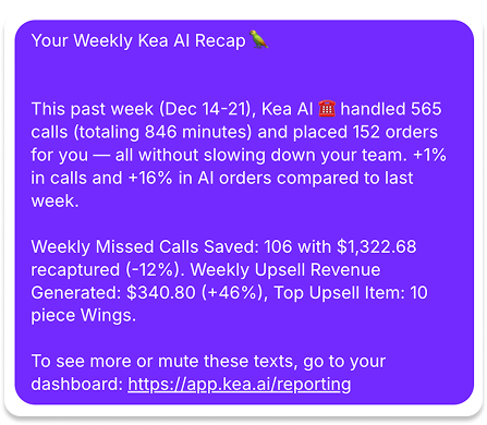 Kea's voice AI now handles 100% of VIA 313's inbound calls, taking orders with a tone and script tailored to the brand's hospitality. It knows their menu inside and out. It can handle complex customizations. And it integrates directly with their POS system for seamless order processing.