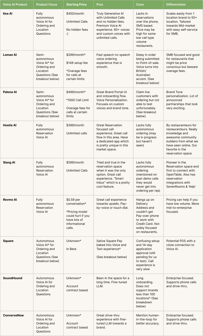 Kea AI stands out as the industry leader with over 30 brands and millions in revenue driven for restaurants. The company has served over 1,000,000 guests and has raised $33M from investors, making it the most established and well-funded solution in the market.