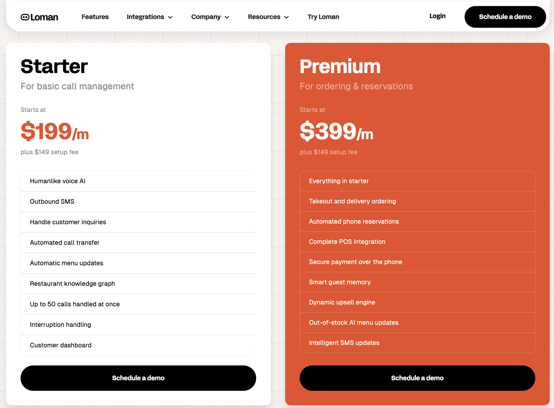 This image displays the pricing comparison between two subscription plans offered by Loman, a call management and ordering service. The Starter plan, priced at $199 per month plus a $149 setup fee, includes features such as humanlike voice AI, outbound SMS, handling customer inquiries, automated call transfer, automatic menu updates, a restaurant knowledge graph, multi-call handling, interruption handling, and a customer dashboard. The Premium plan, priced at $399 per month plus a $149 setup fee, encompasses all Starter features plus additional capabilities for ordering and reservations, including takeout and delivery ordering, automated phone reservations, complete POS integration, secure phone payments, smart guest memory, a dynamic upsell engine, AI-based out-of-stock menu updates, and intelligent SMS updates. Both plans offer a 'Schedule a demo' option to engage with potential customers.