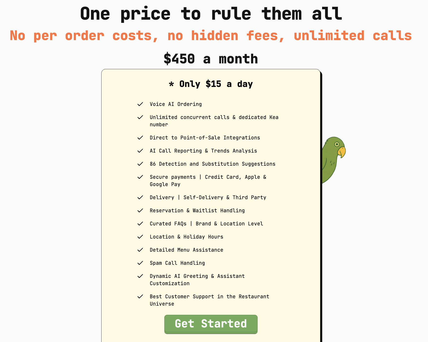 Kea AI has one price with unlimited calls and orders. Plus all the features your restaurant needs and more!