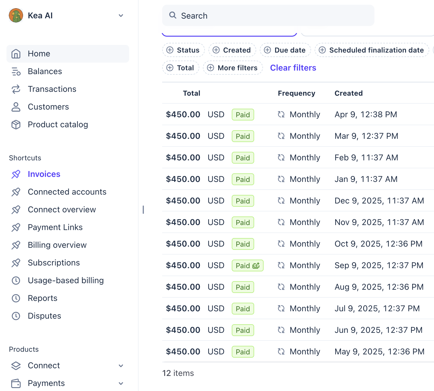 This image displays a section of the Kea AI dashboard focused on the invoice transactions. The left sidebar shows navigation options including Home, Balances, Transactions, Customers, and Product Catalog, along with shortcuts such as Invoices, Connected Accounts, Payment Links, and Billing Overview. The main panel shows a list of 12 invoice transactions, each with a total amount of $450.00 USD, a status marked as 'Paid' in green, a monthly frequency, and respective creation dates spanning from May 9, 2025, to April 9, 2026. This interface is used for managing and tracking recurring invoice payments within the Kea AI platform.Have multiple units or fluctuating volumes? We can work with you on price. Reach out to sales@kea.ai. Kea evaluates pricing based on your telephony needs, but there are never hidden overage fees. Brands with high call volume will benefit from our $450 plan, which includes additional marketing features coming soon.