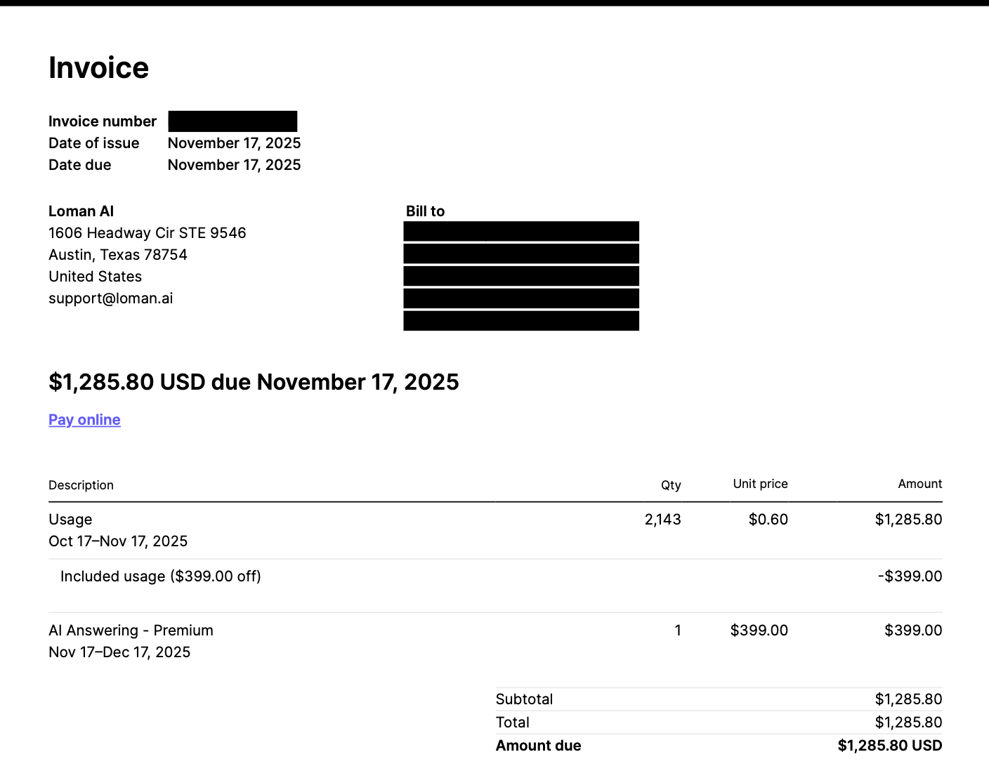 This image shows a detailed invoice issued by Loman AI, a company based in Austin, Texas, with a bill date and due date of November 17, 2025. The invoice is addressed to a client whose details are redacted for privacy. It outlines charges for service usage from October 17 to November 17, 2025, including a quantity of 2,143 units at a unit price of $0.60, totaling $1,285.80 before discounts. A discount of $399.00 is applied as part of the included usage. Additionally, there is a charge for a premium AI answering service covering the period from November 17 to December 17, 2025, priced at $399.00. The subtotal and total amount due are both $1,285.80 USD, with a clear call to action link for online payment. This invoice example is useful for demonstrating professional billing for AI software usage and premium subscription services.