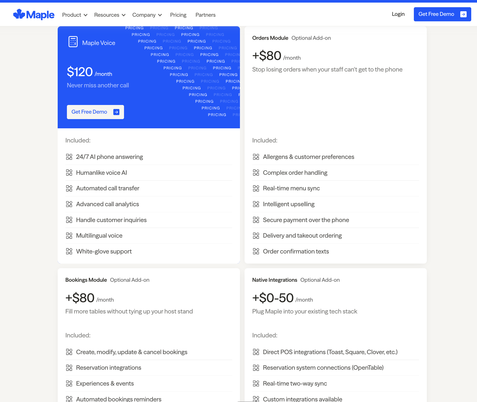 Maple’s Pricing can be confusing on the surface. Most restaurants need everything but the “Bookings Module” to have Voice AI Ordering, which comes out to $240+ for basic functionality like point-of-sale integrations and ordering.