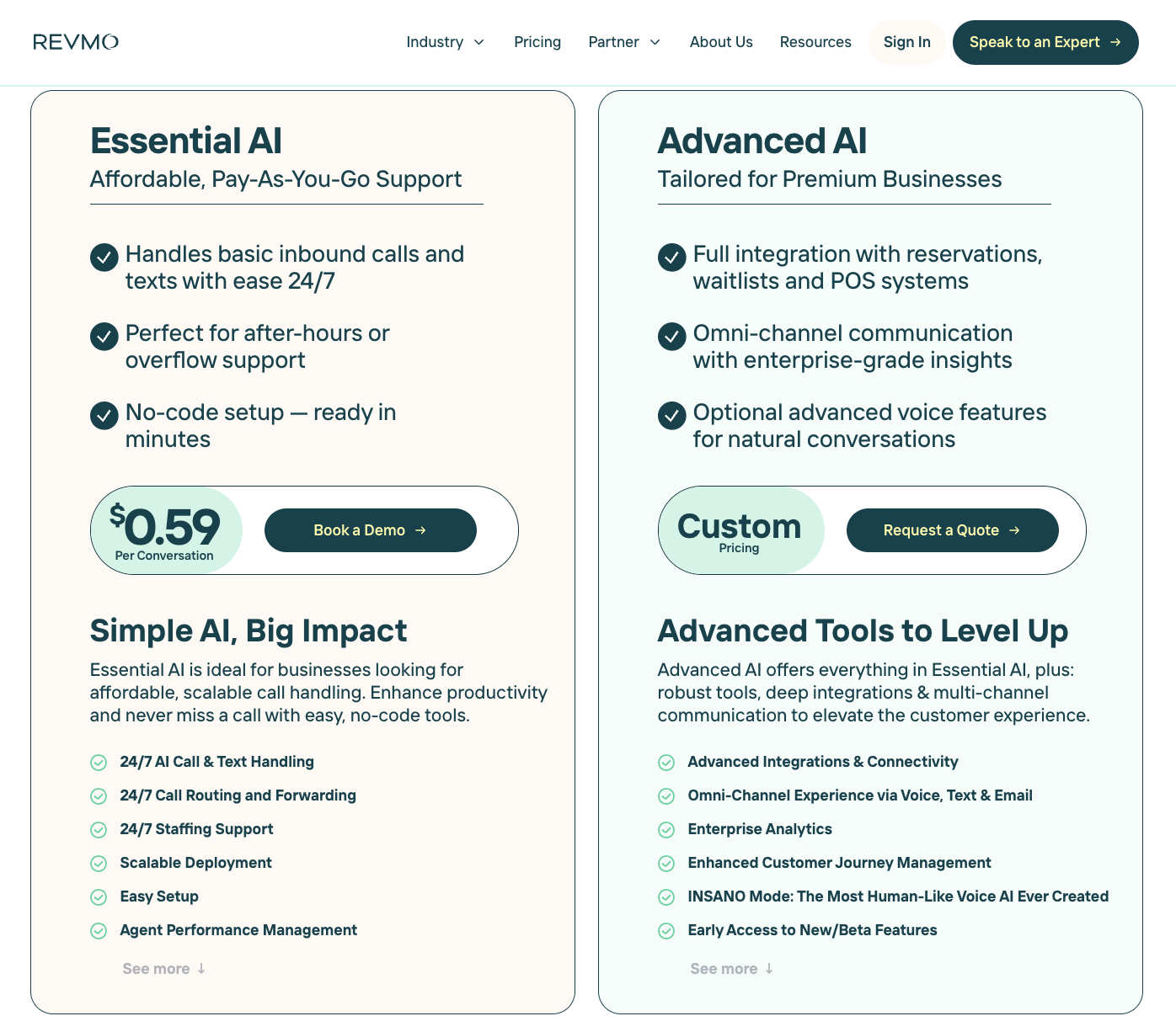 This image shows a side-by-side comparison of REVMO's Essential AI and Advanced AI product tiers, highlighting features and pricing. The Essential AI option is described as affordable, pay-as-you-go support with $0.59 per conversation pricing, providing 24/7 basic inbound call and text handling, no-code setup, and scalable deployment ideal for after-hours or overflow support. The Advanced AI is tailored for premium businesses with custom pricing and offers full integration with reservations, waitlists, and POS systems, omni-channel communication including voice, text, and email, advanced voice features supporting natural conversations, enterprise analytics, enhanced customer journey management, and early access to beta features. The comparison targets businesses seeking scalable AI call and text handling solutions with different levels of integration complexity and feature depth.