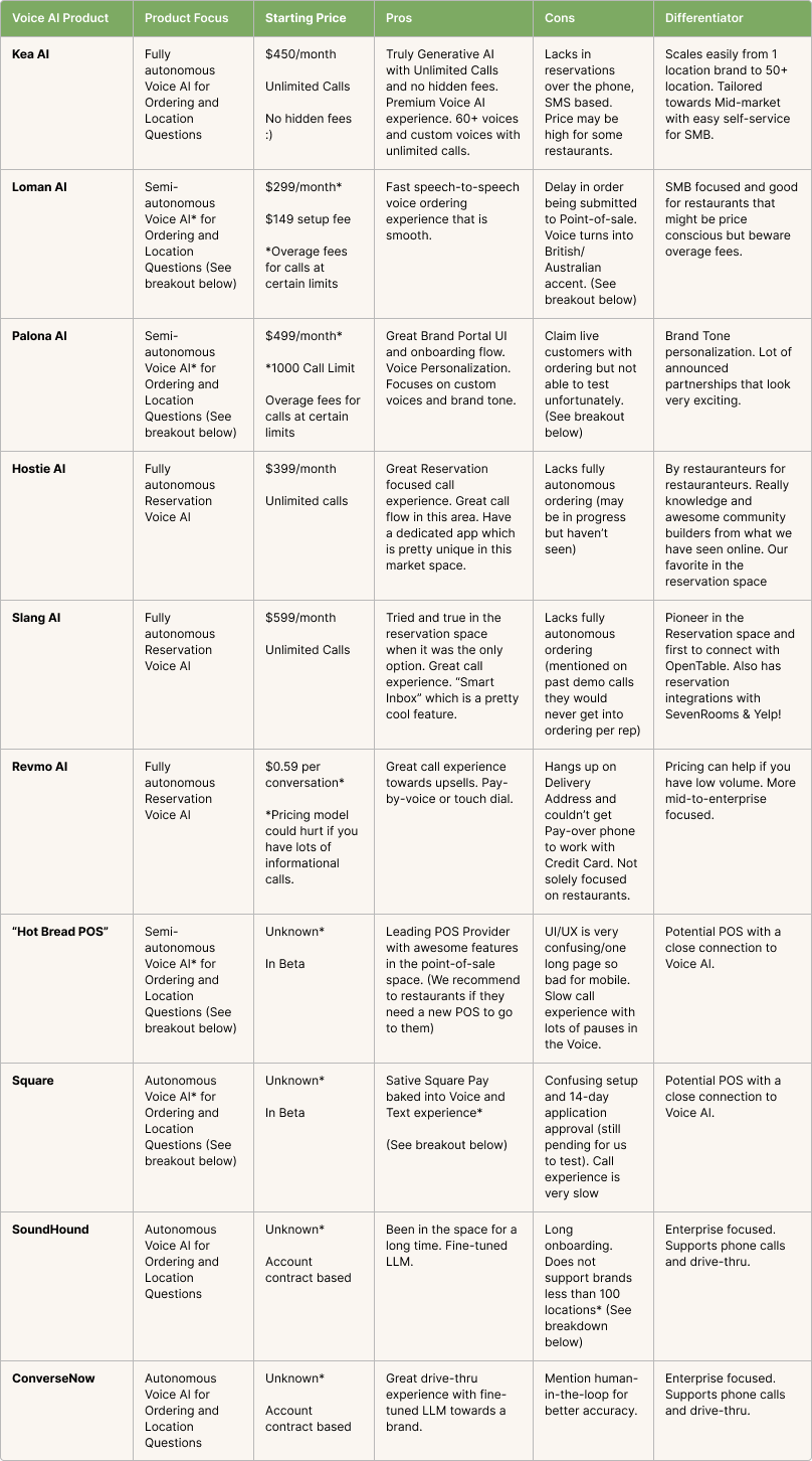 Detailed comparison of Voice AI providers showing pricing, features, and capabilities for restaurant ordering systems.